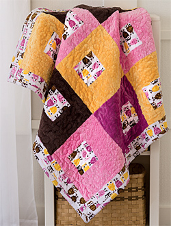 Jennifer Parks, teacher at Holly's Quilt Cabin, designed and made this easy and playful Cuddle quilt. (It was machine quilted by Nancy Metzger.) This adorable quilt features Night Owls by Ann Kelle, a Robert Kaufman Cuddle Collection. The quilt also uses a variety of Cuddle 3, Cuddle Dimple and Cuddle Fleece from Kozy Cuddle solids. Here is what you need to make the quilt: