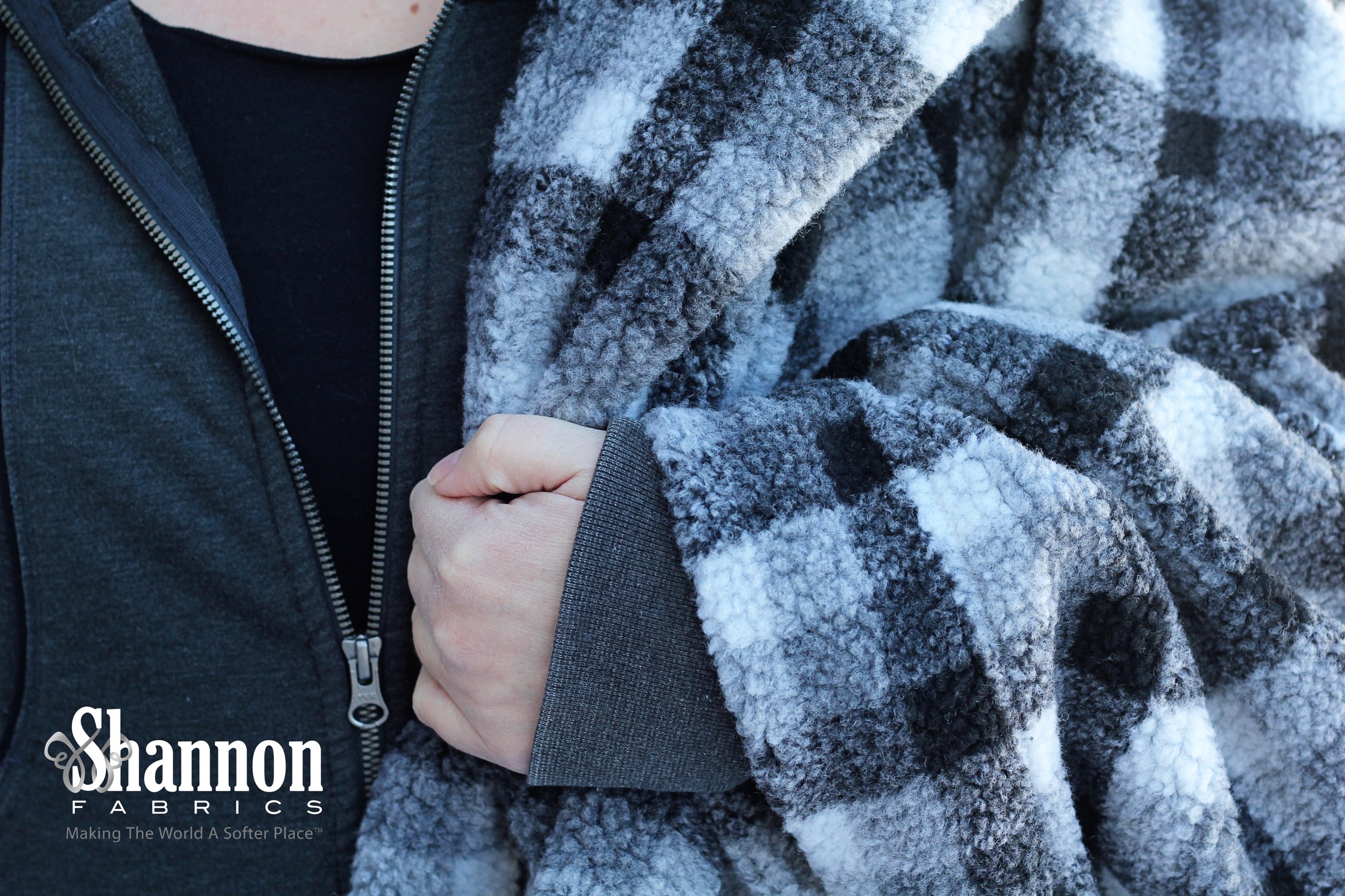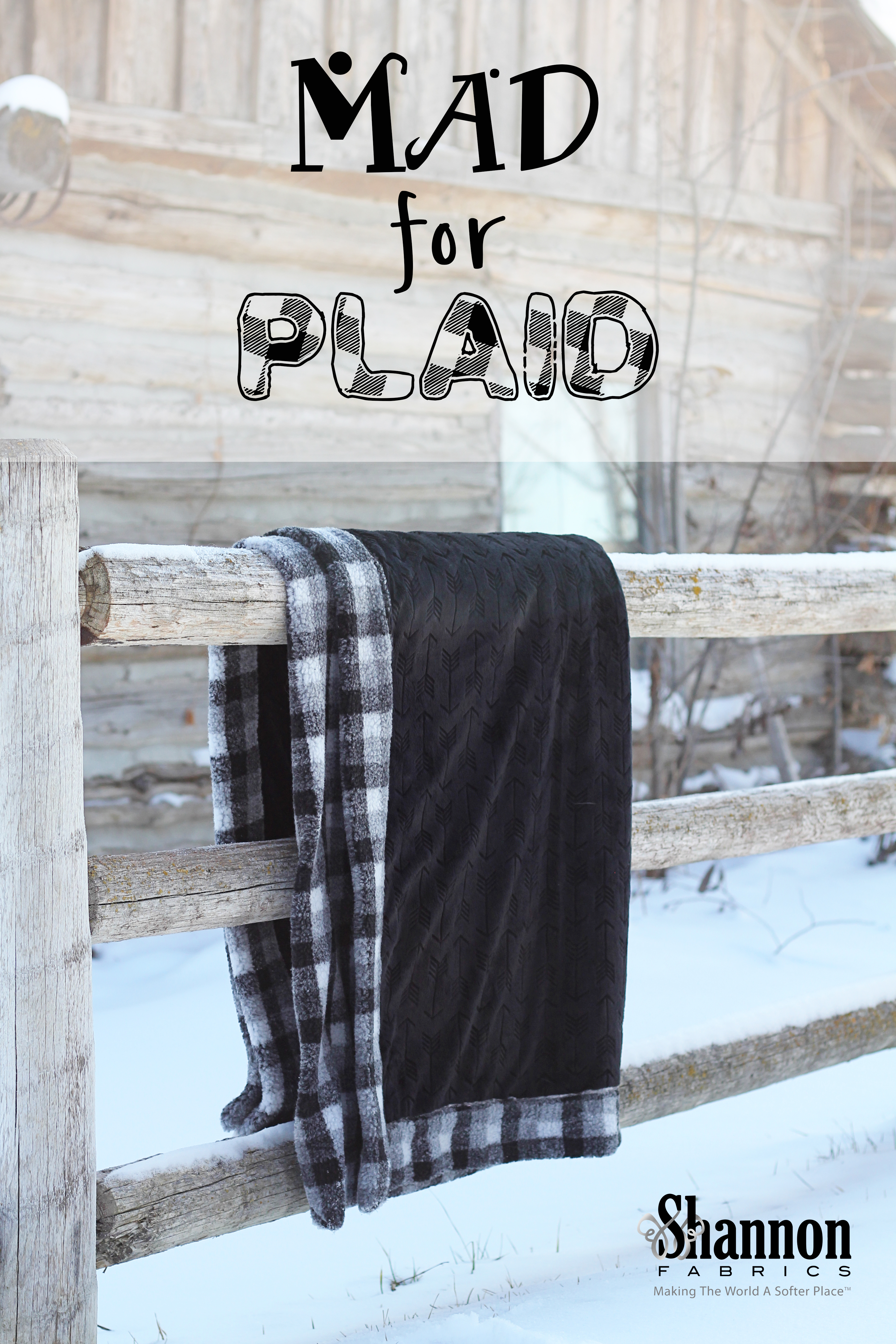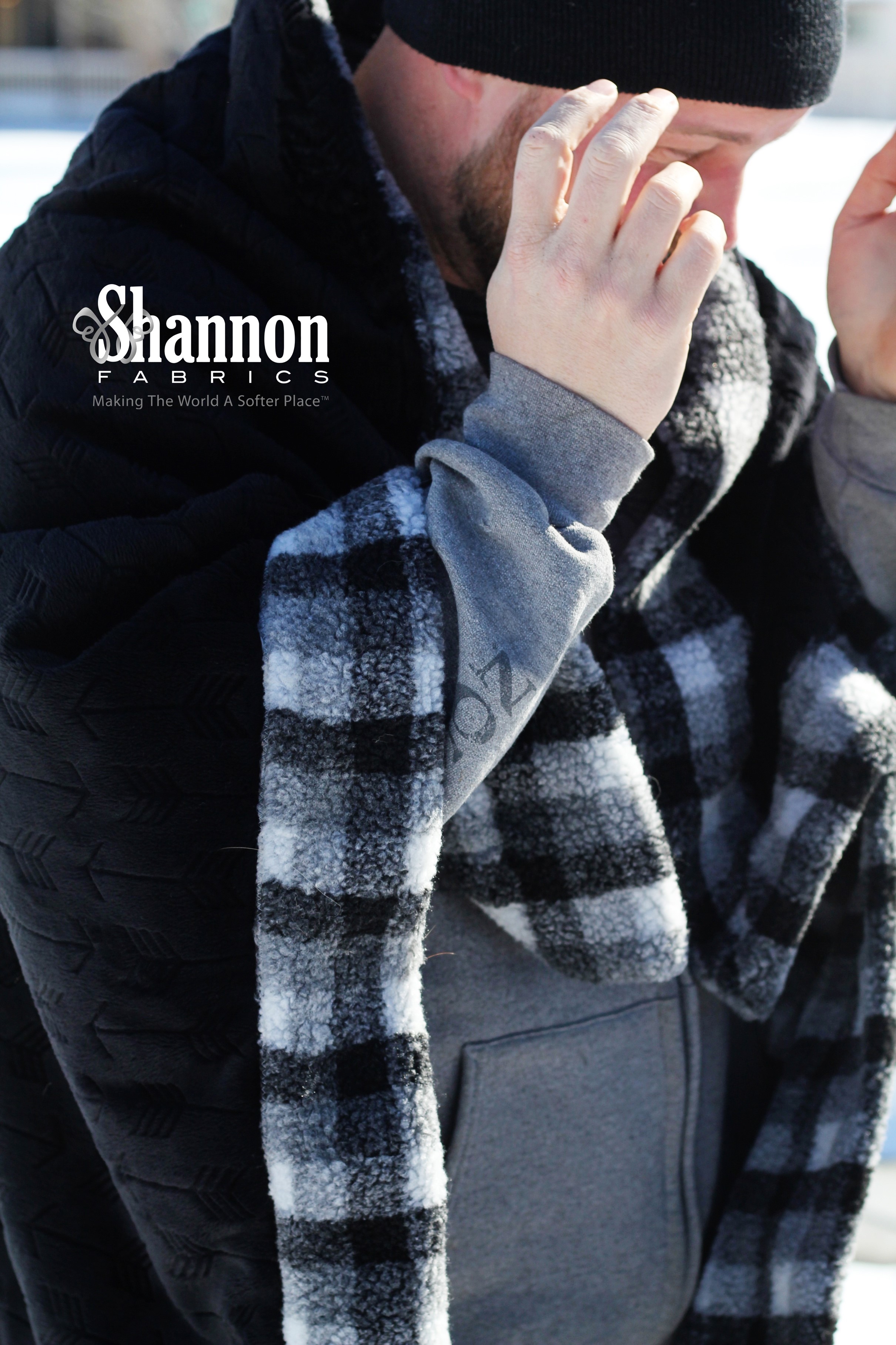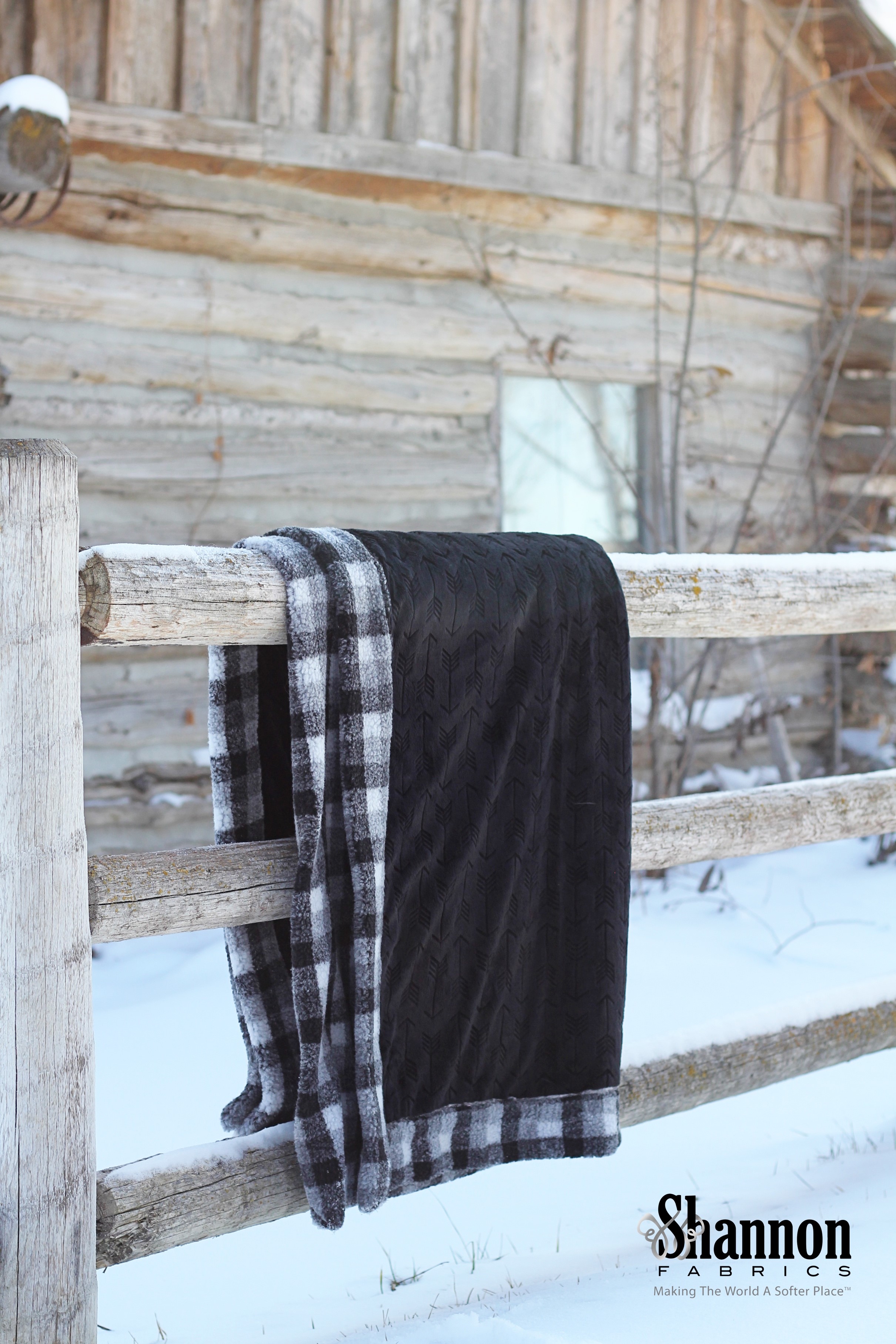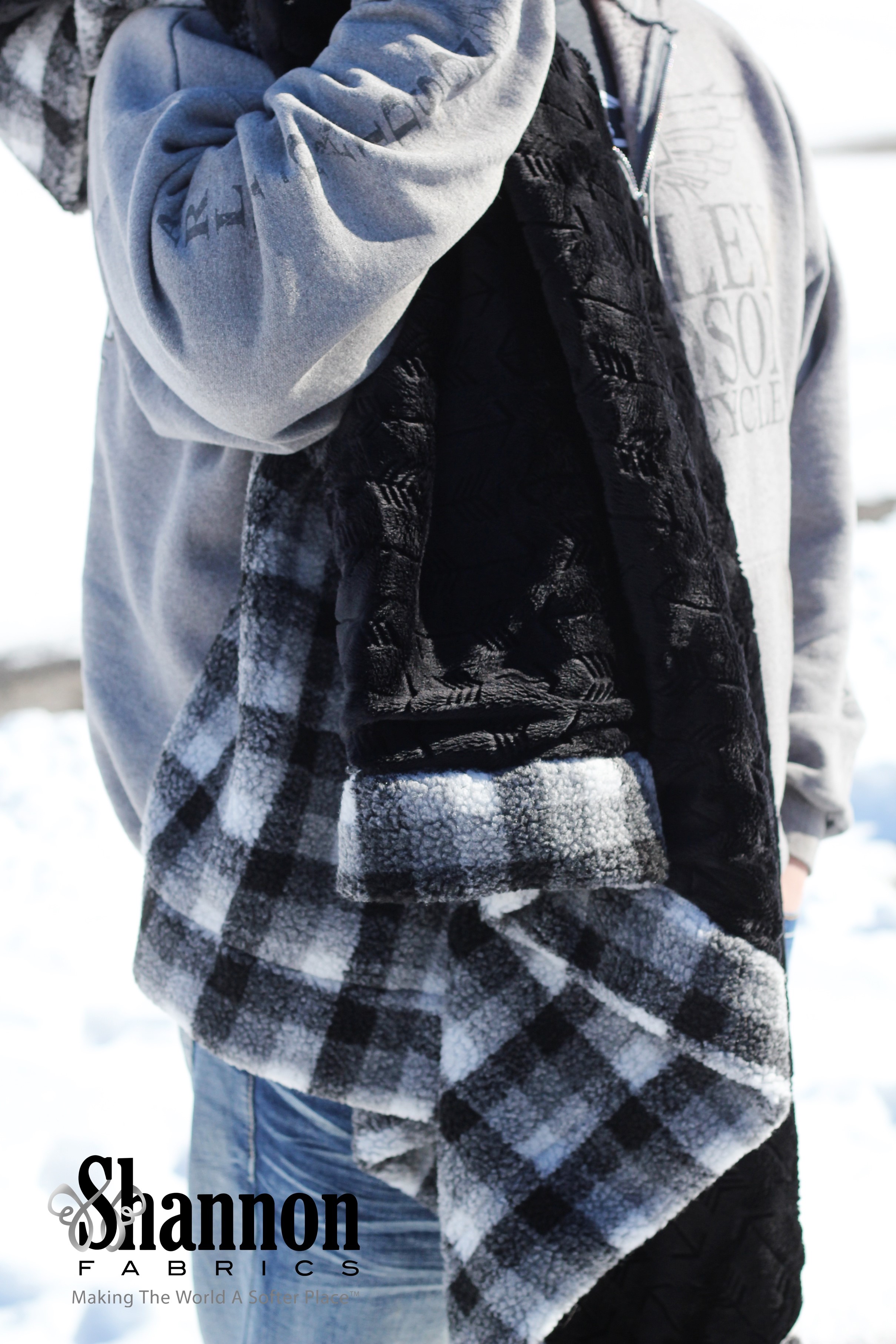 I followed the same basic instructions as the pattern, but changed my outer measurements (Berber Check in Charcoal) to 54” x Width of Fabric (54” x 60”), my inner measurements (Embossed Arrow Cuddle® Black) to 46” x 52”, and I drew my lines at 3” in so that I would have a 3” “border” around the front of my blanket.