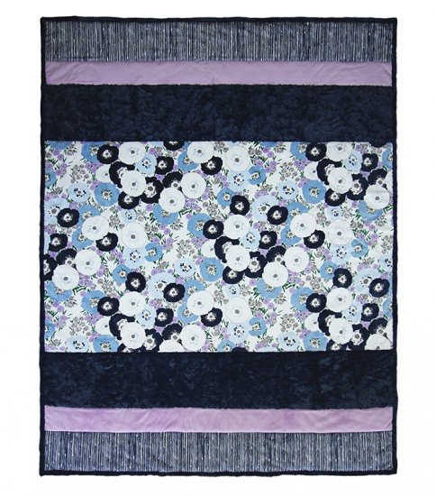 Find it here on our website Sensational Strips Cuddle® Kit English Garden. This stunning kit includes strips for the quilt top and binding, as well as a free pattern. It finishes at approximately 58" x 73". The suggested backing for this kit is Navy, Lilac or Dusty Blue Cuddle® 3 or Cuddle® Dimple and 1 1/8 yards of backing fabric is needed.
