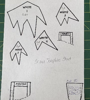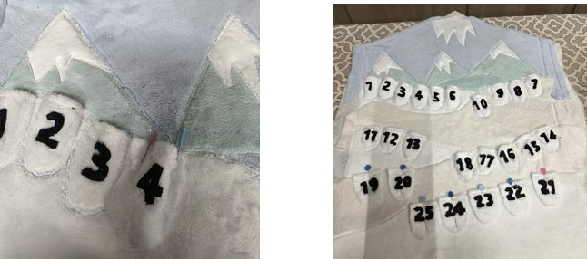 Now that all the pockets are numbered, you will want to lay them out however you want to place them and pin to secure them. I used a satin stitch and my stiletto and sewed each pocket down. You may change your to however you want. I placed mine like the penguin was sliding from one side of the slope to the other going back and forth.