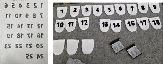 Preparing the pockets is the most time-consuming part of the project. Cut out 25 pieces of white fabric using the Template. The pocket is wider at the top so that when sewn down ii sticks out. You want to make sure that you trace the numbers off the sheet provided so that they will be correct when you fuse them on to the pockets. (You could also buy ¾”” stick on numbers if you don’t want to cut them all out)
